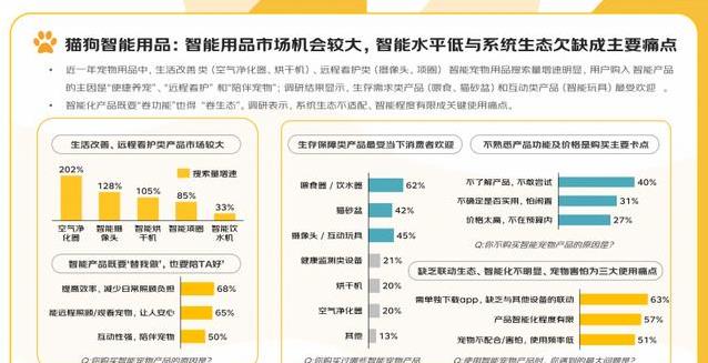 宠物用品也越来越“高科技”。小姜最近看上了一款智能喂食器,能定时定量给乐乐喂饭,下班晚了也不用担心它饿肚子。报告里说,宠物空气净化器和摄像头特别受欢迎,搜索量分别涨了202%和128%。这些智能设备让养宠更省心,68%的人买这些是为了减轻照顾的负担,65%的人想通过摄像头随时看看宠物在干嘛。不过,也有不少人吐槽,智能设备用起来不顺手,APP不好用,设备之间还连不上,体验有点“卡壳”。