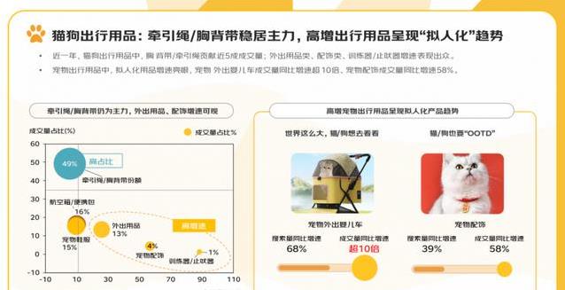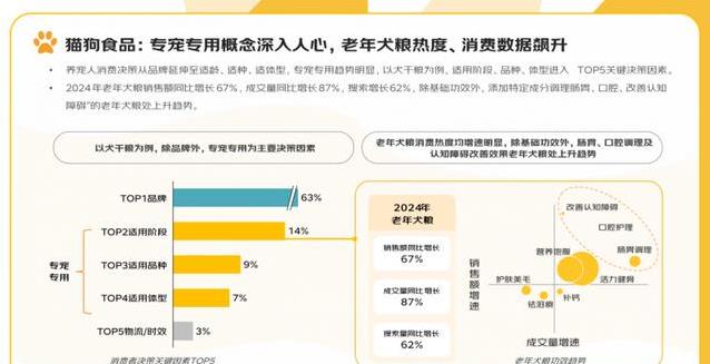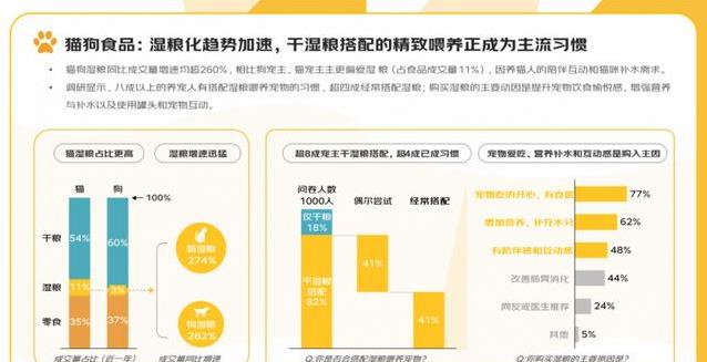 养宠物就像养孩子,得操心吃喝拉撒。小姜给乐乐买了专属的狗粮,还特意挑了老年犬粮,因为乐乐年纪大了,肠胃得好好养。报告里说,老年犬粮最近特别火,搜索量涨了62%,销量更是暴增87%。不光是狗粮,猫粮也讲究起来了。八成养宠人开始混着干粮和湿粮喂,湿粮的销售额涨了260%以上!这可不是随便喂点剩饭就行,养宠人得研究哪款粮适合自己家宝贝的体型、年龄和口味,就像给家人做饭一样用心。